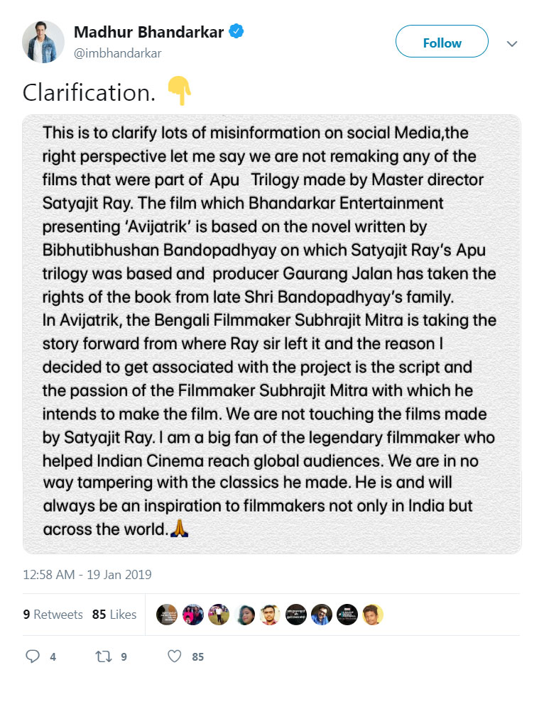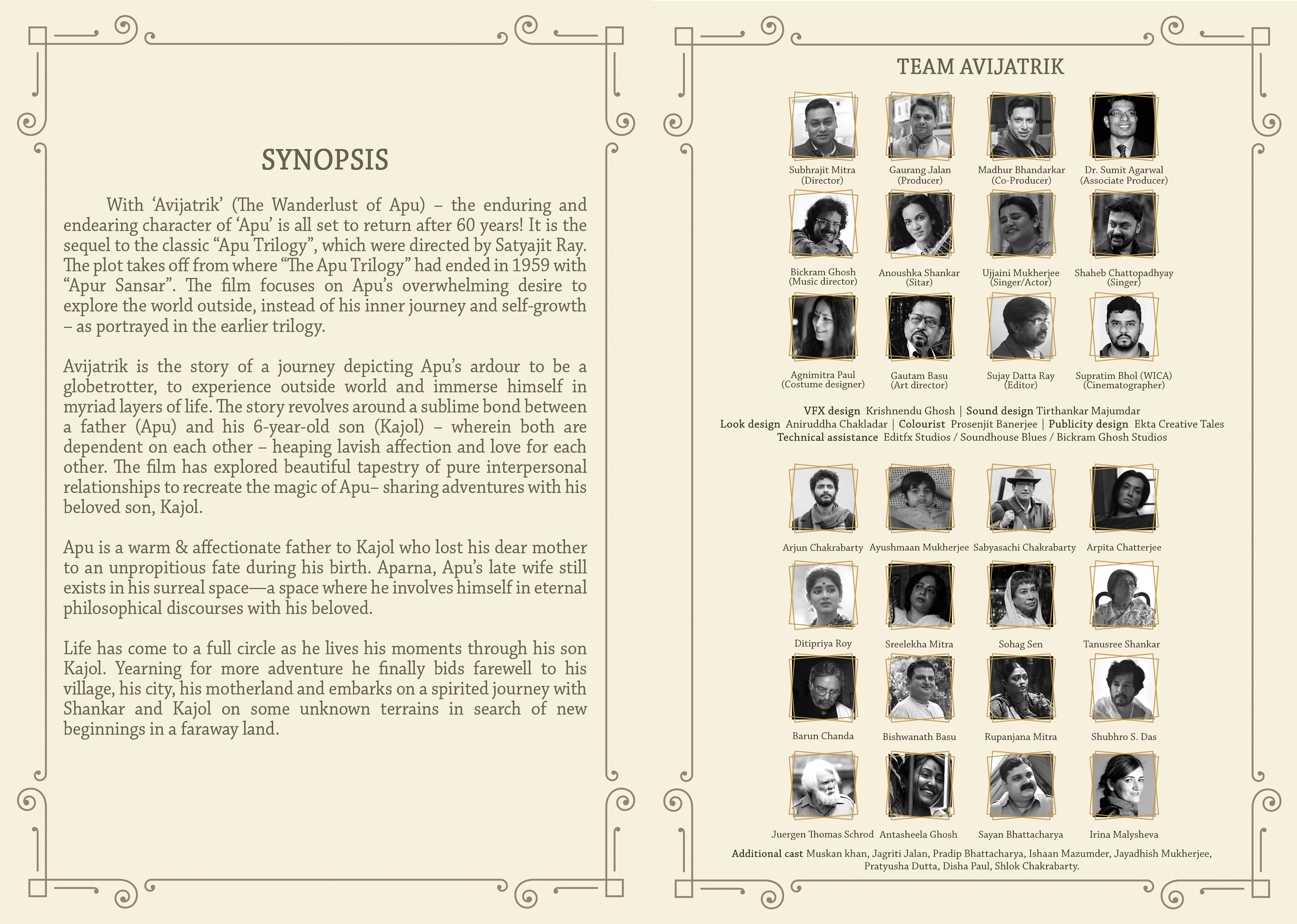 “Apu” - the legendary enduring and endearing character is all set to return on silver screen after 60 years in a Bengali period drama feature film, “Avijatrik”. The storyline is based on the concluding part of the epic novel “Aparajito”, written by one of the leading Bengali litterateurs, late Bibhutibhushan Bandopadhyay. The film will be directed by Subhrajit Mitra. It is the sequel to the classic “Apu Trilogy”, directed by Satyajit Ray. The plot takes off from where “The Apu Trilogy” had ended in 1959, with “Apur Sansar”. This film, “ Avijatrik”, focuses on the wanderlust of the main protagonist and the story of a sublime bond between a father and a son. The story is of Apu and his 6 year old son Kajol.. We are set to witness the comeback of other reminiscing characters in different real & surreal poetic forms, such as Dugga, Aparna, Ranu Di and Lila. Though Lila was never a part of the trilogy, she was a major character in the original novel. Another surprise entry for the audience would be the introduction of Apu’s middle aged adventurer friend, Shankar, who also happened to be another legendary fictional character by the author himself and is set to become the driving force in Apu and Kajol’s life in this film. “Avijatrik” will witness a plethora of international cast and crew. Shooting of “Avijatrik” is complete. The film has been shot with an ensemble of experienced cast and crew at various locations in Varanasi, Dooars in North Bengal, Taki, Bolpur and parts of Kolkata, in black & white to retain the rich aesthetic flavor that compliments its backdrop of 1940’s India. Music of the film is by internationally acclaimed exponents of the Indian classical genre. Major National and International production houses are extending their help for technical assistance and international and national distribution opportunities attempting to recreate the magic of Apu on big screen again, to enthrall the audiences.
